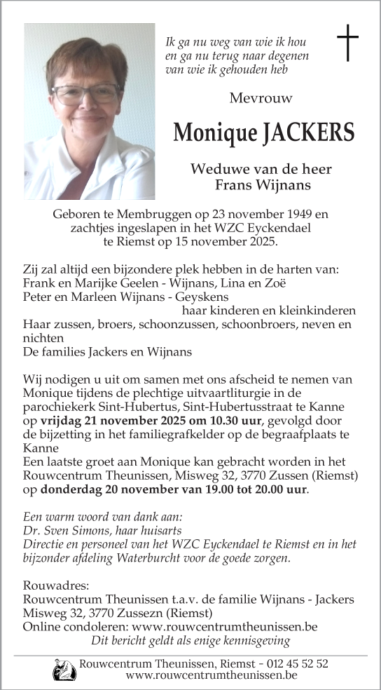Décédée à Riemst (3770) le samedi 15 novembre 2025 à l'âge de 75 ans