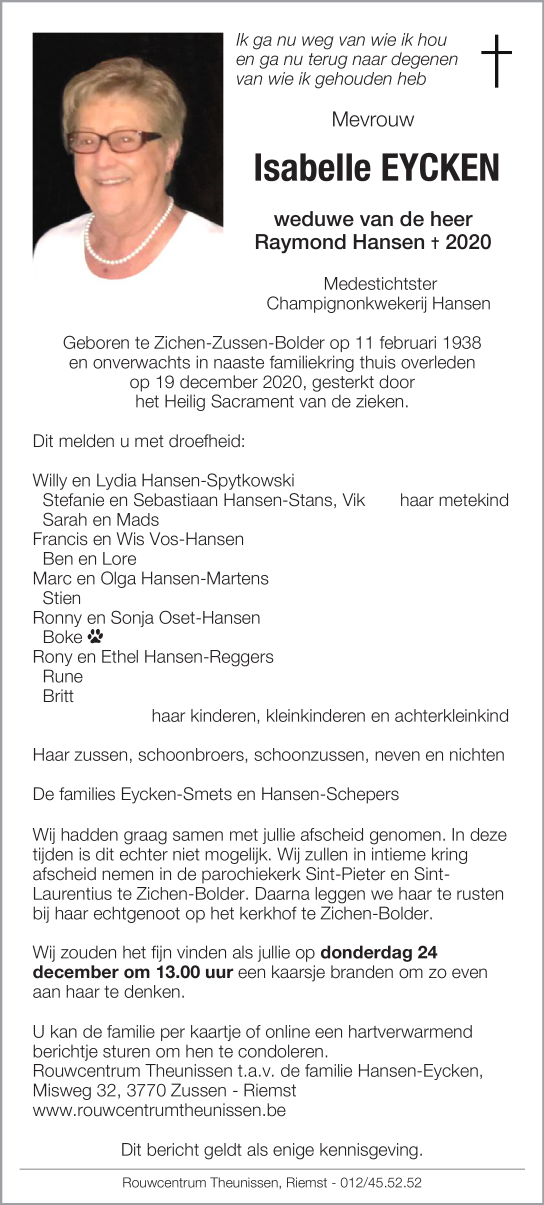 Décédée à Zichen-Zussen-Bolder (3770) le samedi 19 décembre 2020 à l'âge de 82 ans