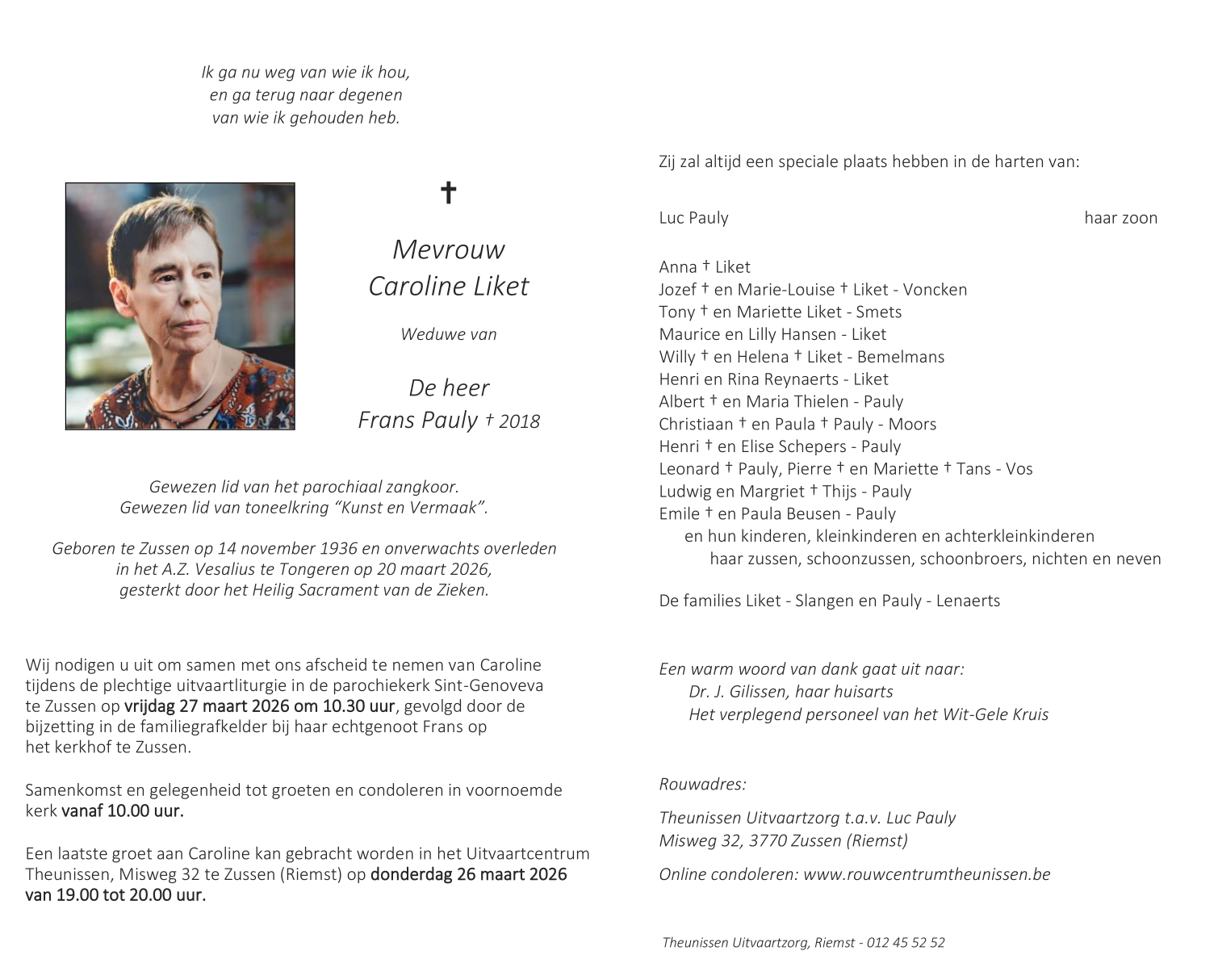Décédée à Tongeren-Borgloon (3700) le vendredi 20 mars 2026 à l'âge de 89 ans