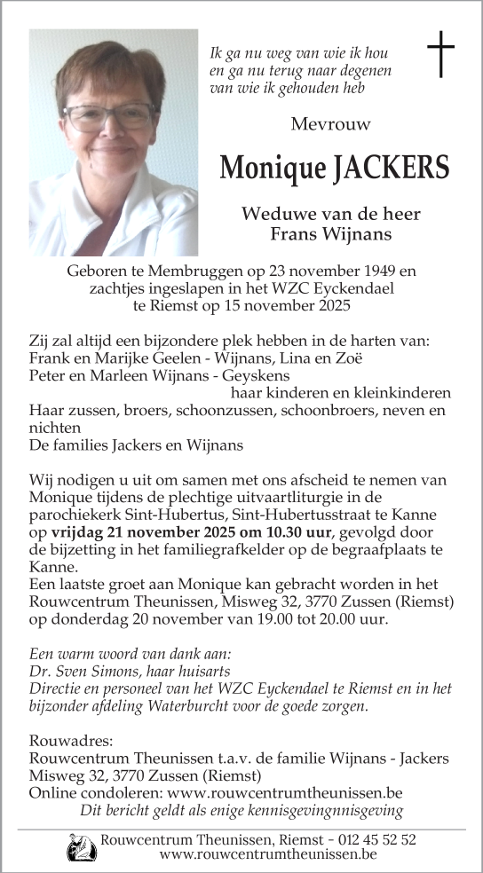 Décédée à Riemst (3770) le samedi 15 novembre 2025 à l'âge de 75 ans