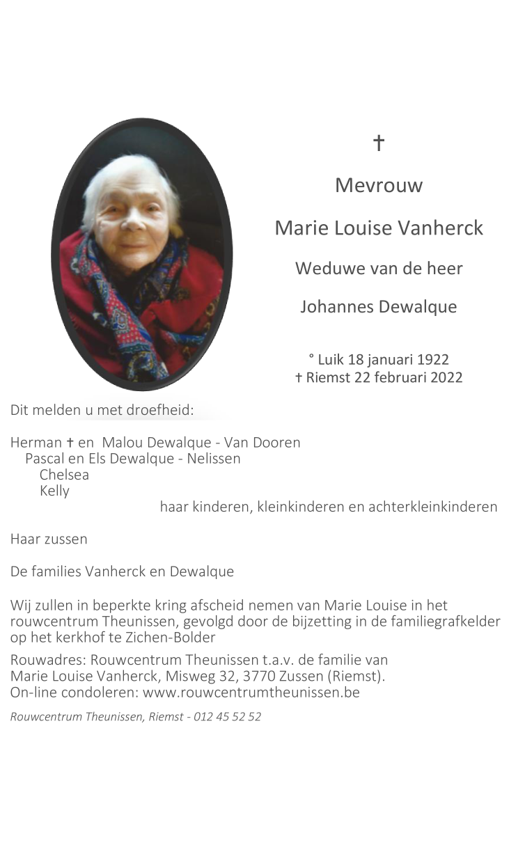 Décédée à Riemst (3770) le mardi 22 février 2022 à l'âge de 100 ans