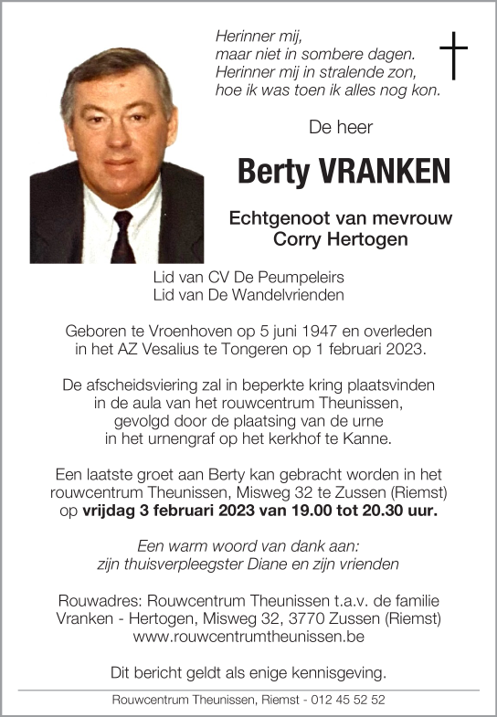 Décédé à Tongeren (3700) le mercredi 1 février 2023 à l'âge de 75 ans