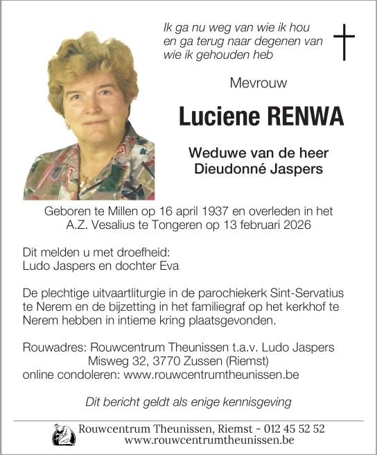 Décédée à Tongeren-Borgloon (3700) le vendredi 13 février 2026 à l'âge de 88 ans