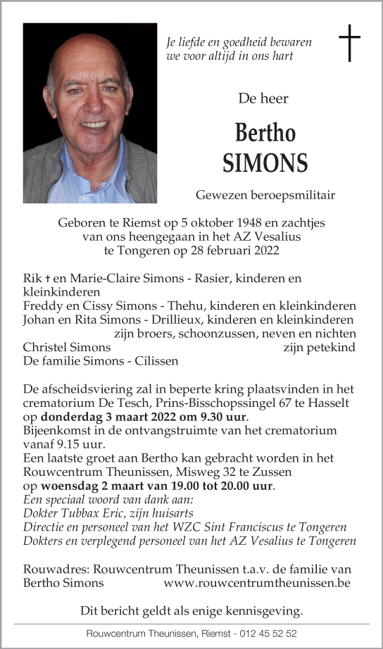 Décédé à Tongeren (3700) le lundi 28 février 2022 à l'âge de 73 ans