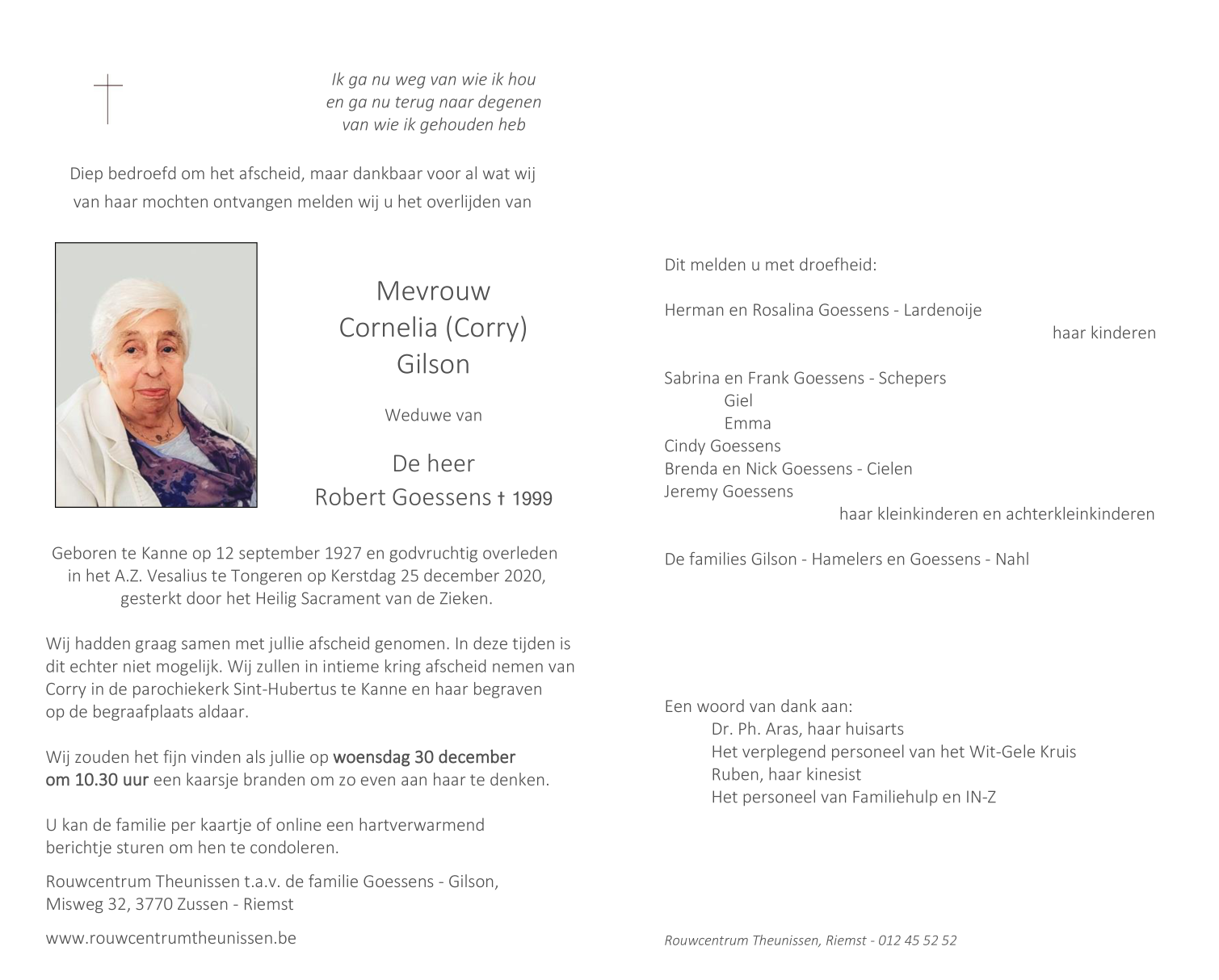 Décédée à Tongeren (3700) le vendredi 25 décembre 2020 à l'âge de 93 ans