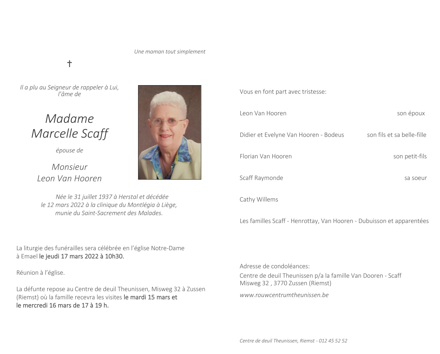 Décédée à Liège (4000) le samedi 12 mars 2022 à l'âge de 84 ans