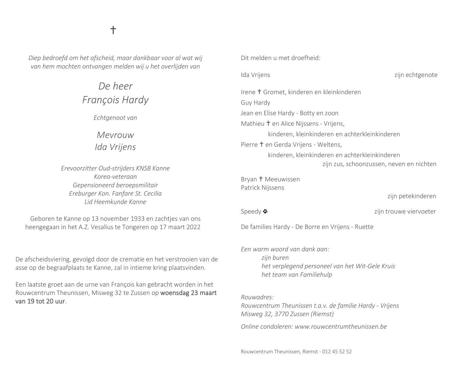 Décédé à Tongeren (3700) le jeudi 17 mars 2022 à l'âge de 88 ans