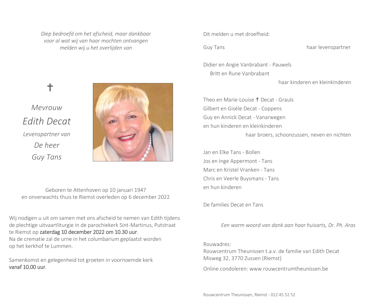 Décédée à Riemst (3770) le mardi 6 décembre 2022 à l'âge de 75 ans